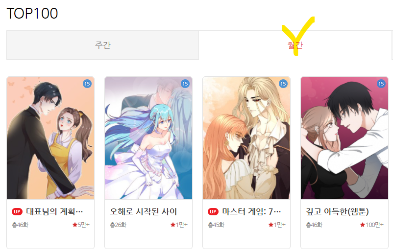이제 미툰에 가입을 완료했으니 첫 작품을 감상하러 가야겠죠. 홈페이지 상단의 웹툰 메뉴를 클릭해서 TOP 100을 찾아보았습니다. TOP 100에서 주간 및 월간 TOP1 작품을 하나 골라 보겠습니다.