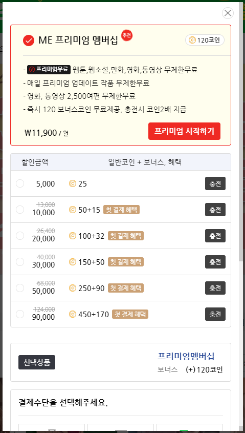 미툰은 처음은 무료 회원가입이지만 추후 월 구독료 지불 형태의 ME 프리미엄 멤버십을 가입하실 분들은 월 \11000원으로 이용이 가능합니다.