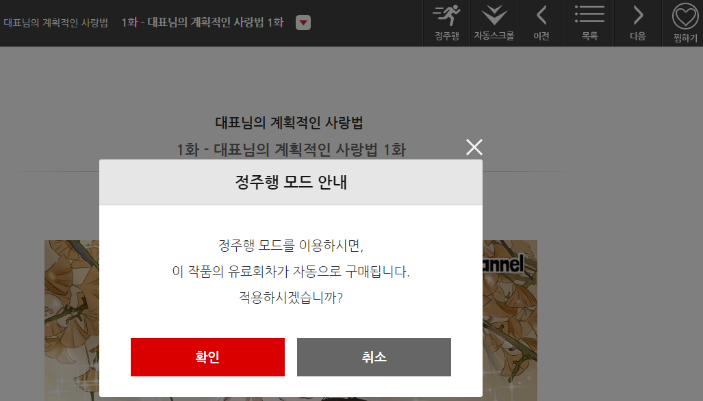 ※ 단, 정주행 모드의 경우 대부분이 무료인 1회부터 순차적으로 감상하다가 유료 회차가 되면 자동으로 구매되기 때문에 주의하셔야 합니다.